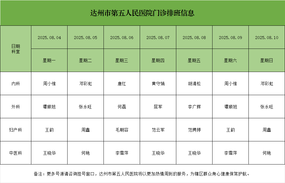 达州市第五人民医院 2025年8月4日—8月10日(含周末)门诊排班